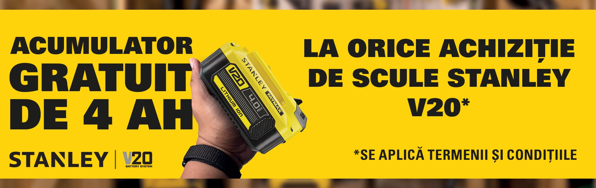 Cumpără orice unealtă STANLEY® V20 între 23 Martie - 31 Mai 2026 și revendică un cadou gratuit.