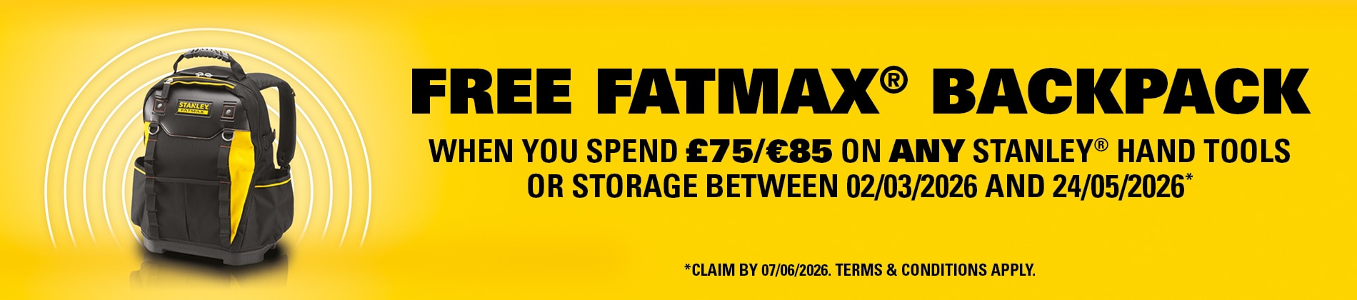 Spend £75 / €85 on any STANLEY® Hand Tools or Storage products and claim a FREE STANLEY® FATMAX® Backpack*.